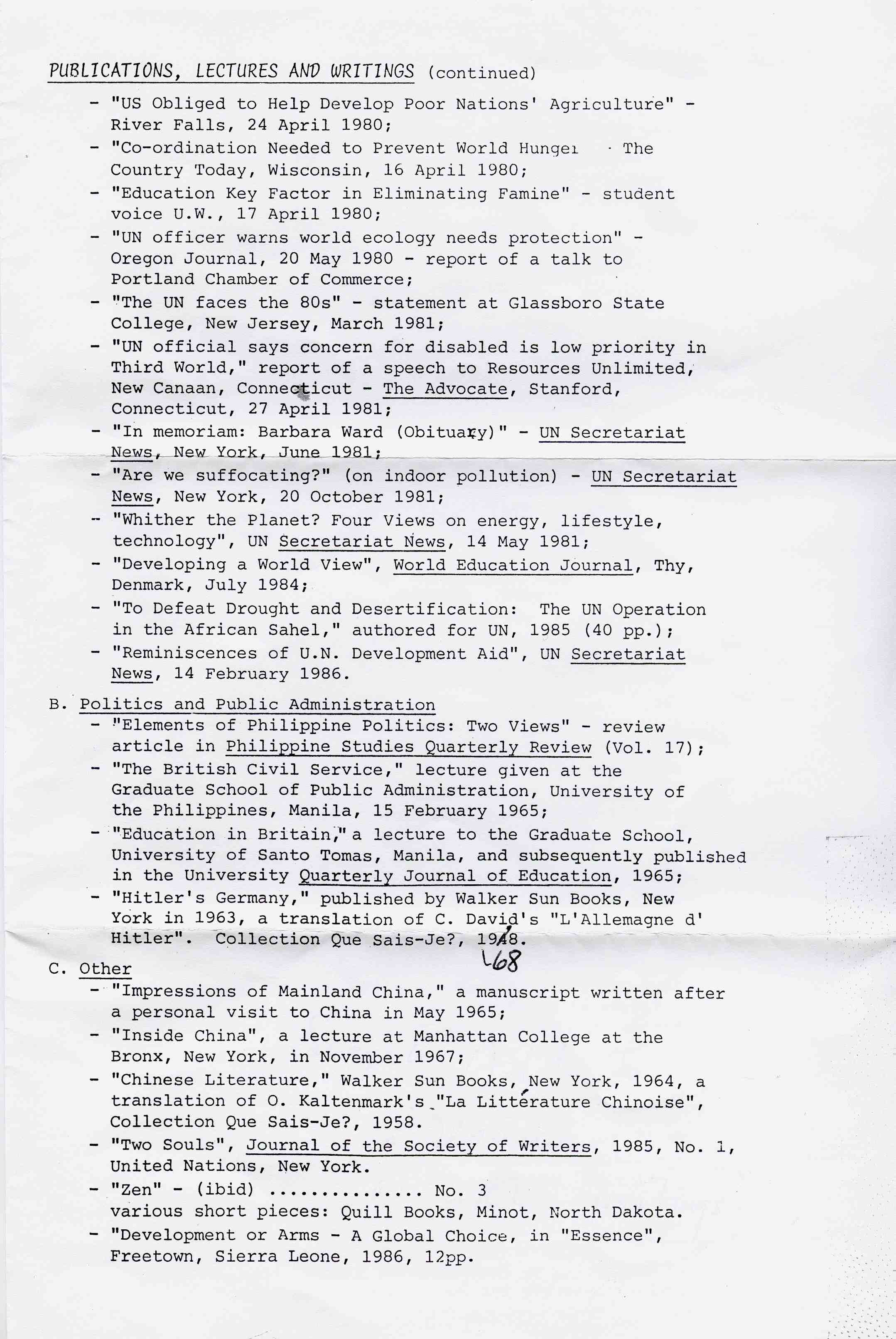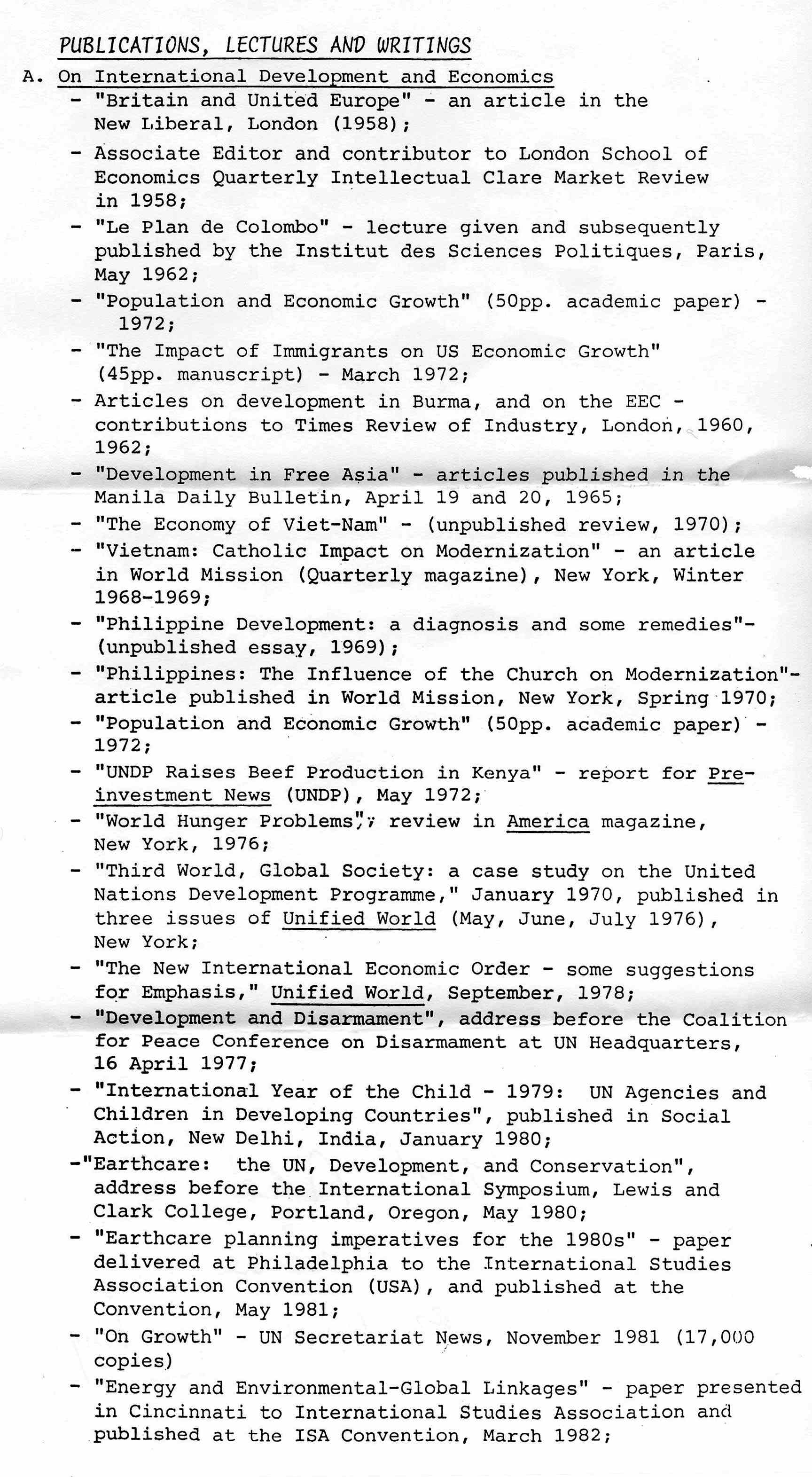 Assigned to Office of Administrator of the United Nations Development Programme, UNDP 1966-68. New York